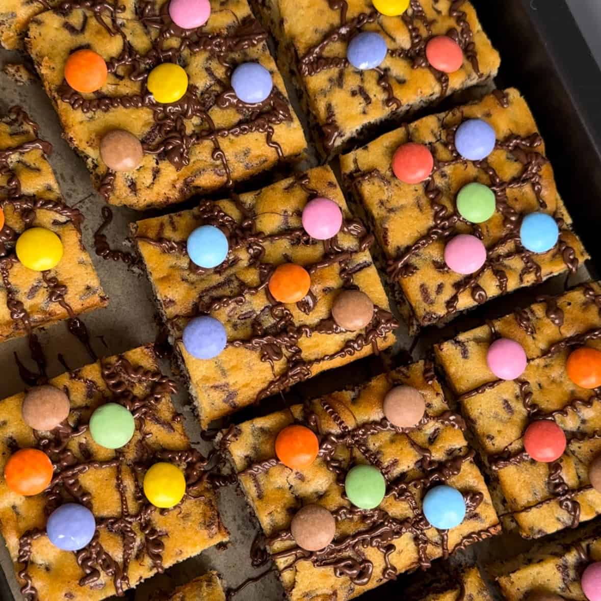 Der Ameisenkuchen war bei meinen beiden Kindern immer DER Renner. Nun sind sie erwachsen und er erfreut sich immer noch großer Beliebtheit. Natürlich darf er nur so gerade durch sein mit etwas Klitschigkeit in der Mitte. Der Ameisenkuchen eignet sich auch super für Veranstaltungen, wo Kuchen auf der Hand gefragt ist. Man kann ihn super einen Tag vorher backen und in Punkto Verzierung ist er für alles offen. Bei uns am liebsten nackig – ganz ohne Schnickschnack oben drauf. Dieser Armeisenkuchen war für ein Reitturnier bestimmt und da das Auge ja bekanntlich mitisst, habe ich diesen Ameisenkuchen mit Zartbitterschokolade und weißen Smarties verziert.