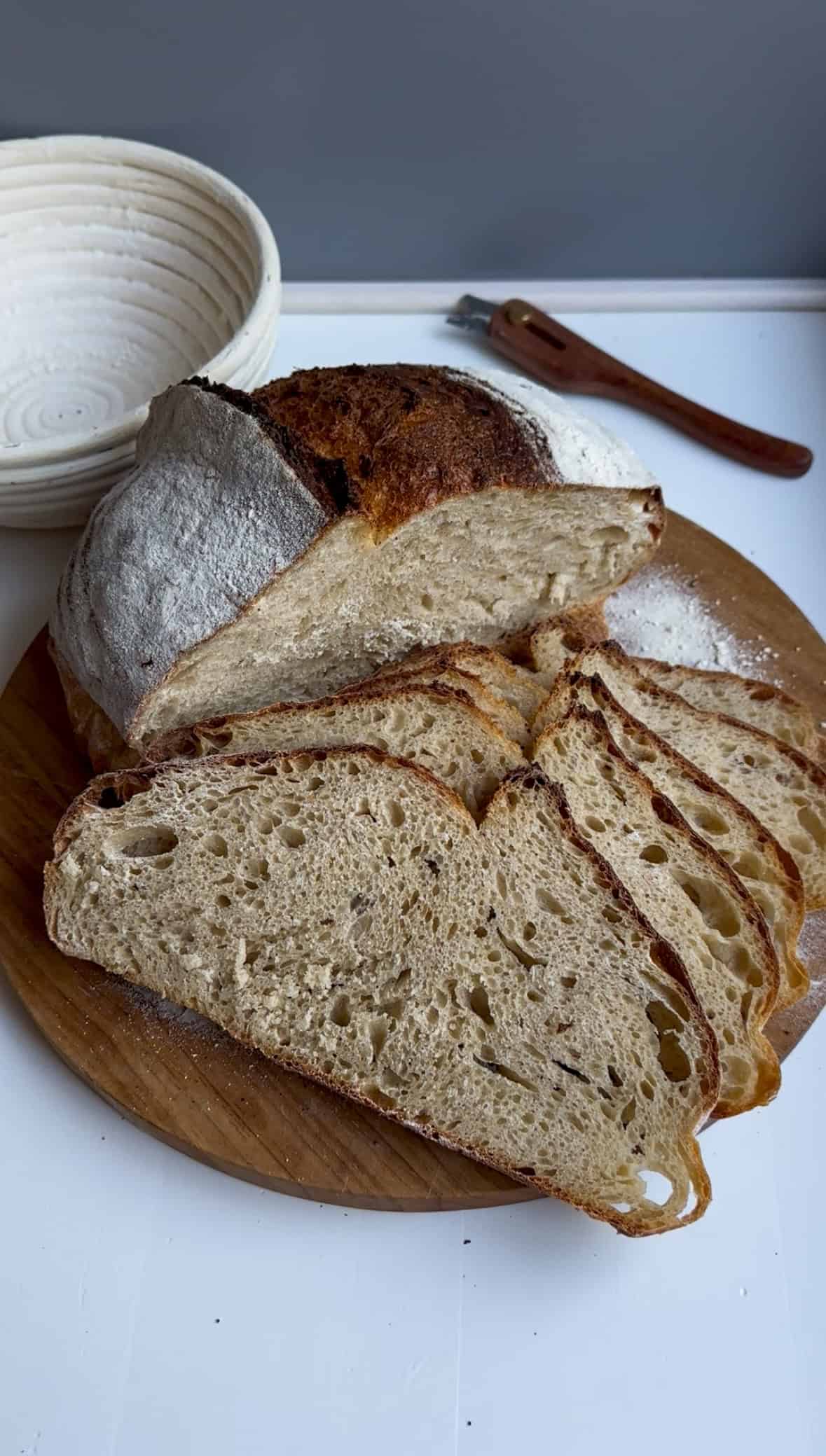 Wir haben einen echt hohen Durchsatz an Brot. Ich backe allerdings auch immer nur mit 500 g Mehl. Da das Brot schon wieder fast alle war am Morgen, musste eine Variante her, die ich noch abends backen konnte und so habe ich das Buttermilch Sauerteigbrot gemacht. Damit es auch schnell geht, wird hier etwas Hefe dazu gegeben. Du kannst aber auch die Sauerteigmenge auf 100 g erhöhen und die Stückgare über Nacht im Kühlschrank durchführen an Stelle der 1-1.5 Stunden Stückgare bei Zimmertemperatur.