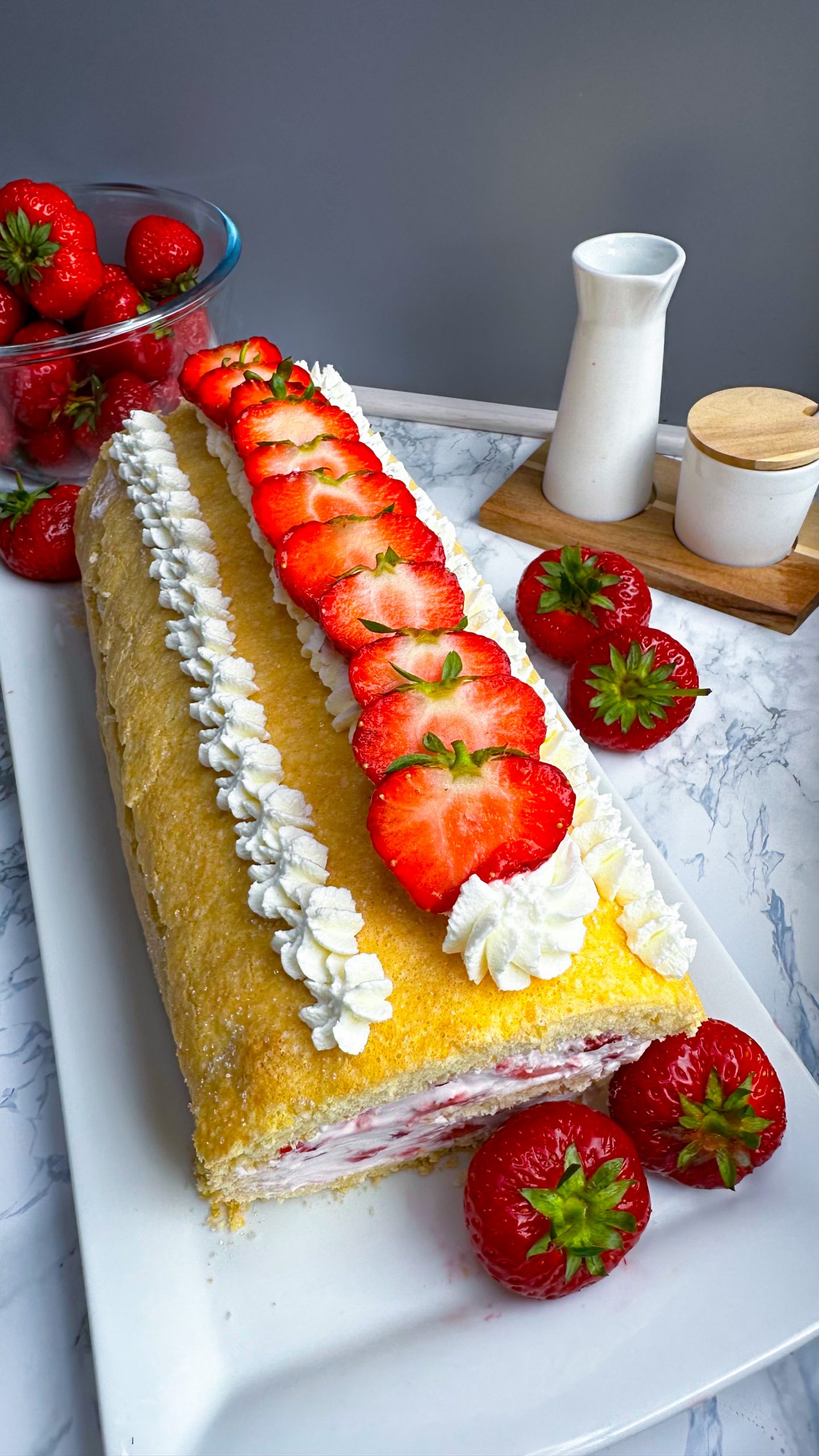- Die Creme auf den Biskuitboden streichen und das Ganze vorsichtig aufrollen.