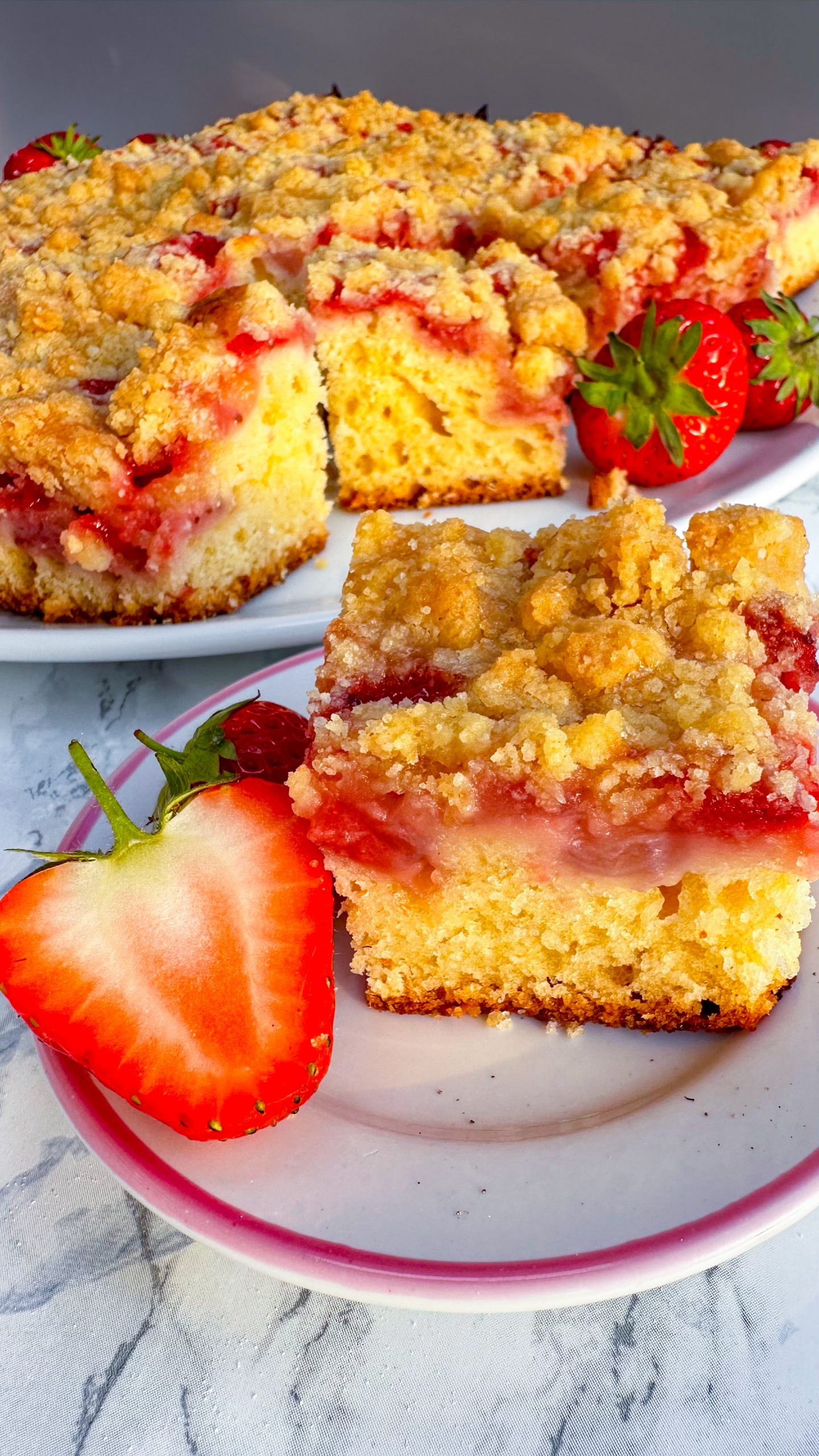 Leckere Erdbeeren mit knusprigen Streuseln auf einem lockeren Rührteig