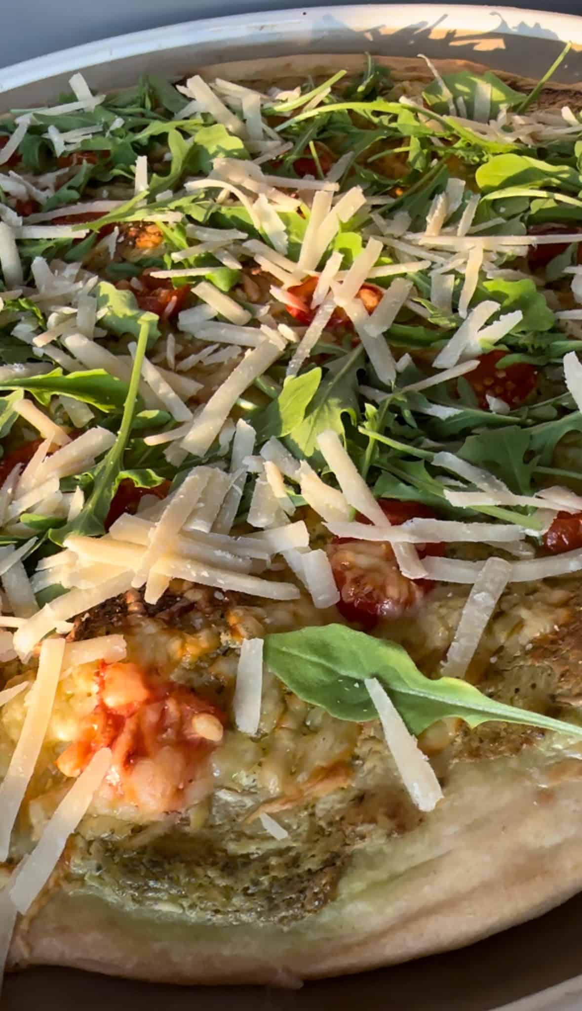 Der Teig für Flammkuchen ist in 1 Minuten hergestellt und die Zutaten dafür hat man eigentlich immer im Haus – also ein mega einfaches Flammkuchen Rezept. Den Belag kann man nach belieben wählen. Es muss ja nicht immer klassisch mit Speckwürfel und Zwiebel sein. Wie mögen es auch mit gekochtem Schinken und Mais oder aber wie hier, das Creme Fraiche mit grünem Pesto mischen, dann frische Cocktailtomaten drauf, etwas geriebenen Käse. Dann 15 Minuten bei 230 Grad backen und dann frischen Rucola drauf, etwas frisch geriebenen Parmesan und dann noch etwas Balsamico Creme. Einfach lecker!