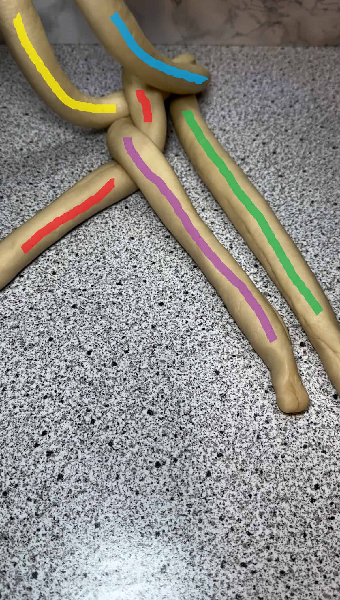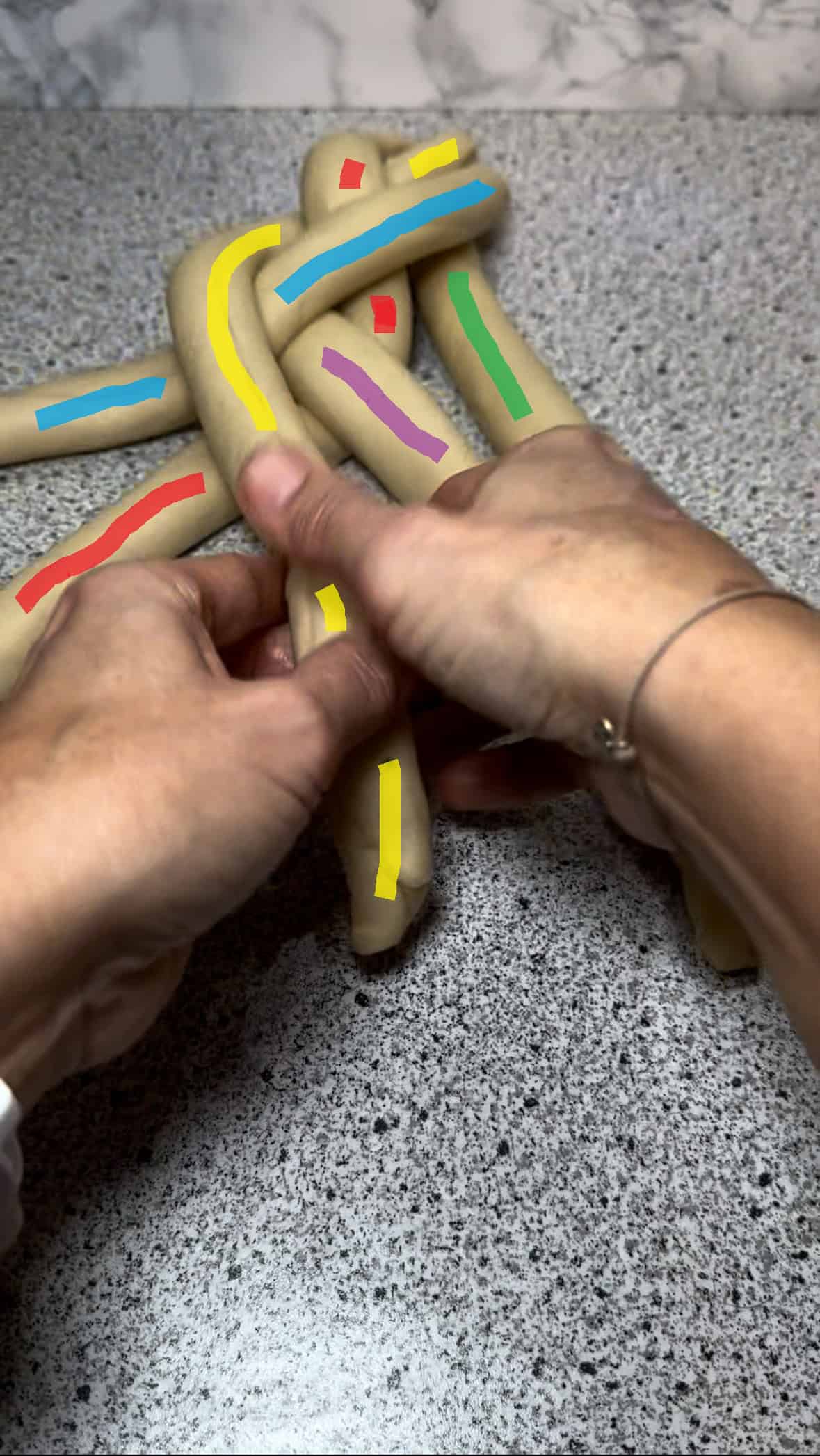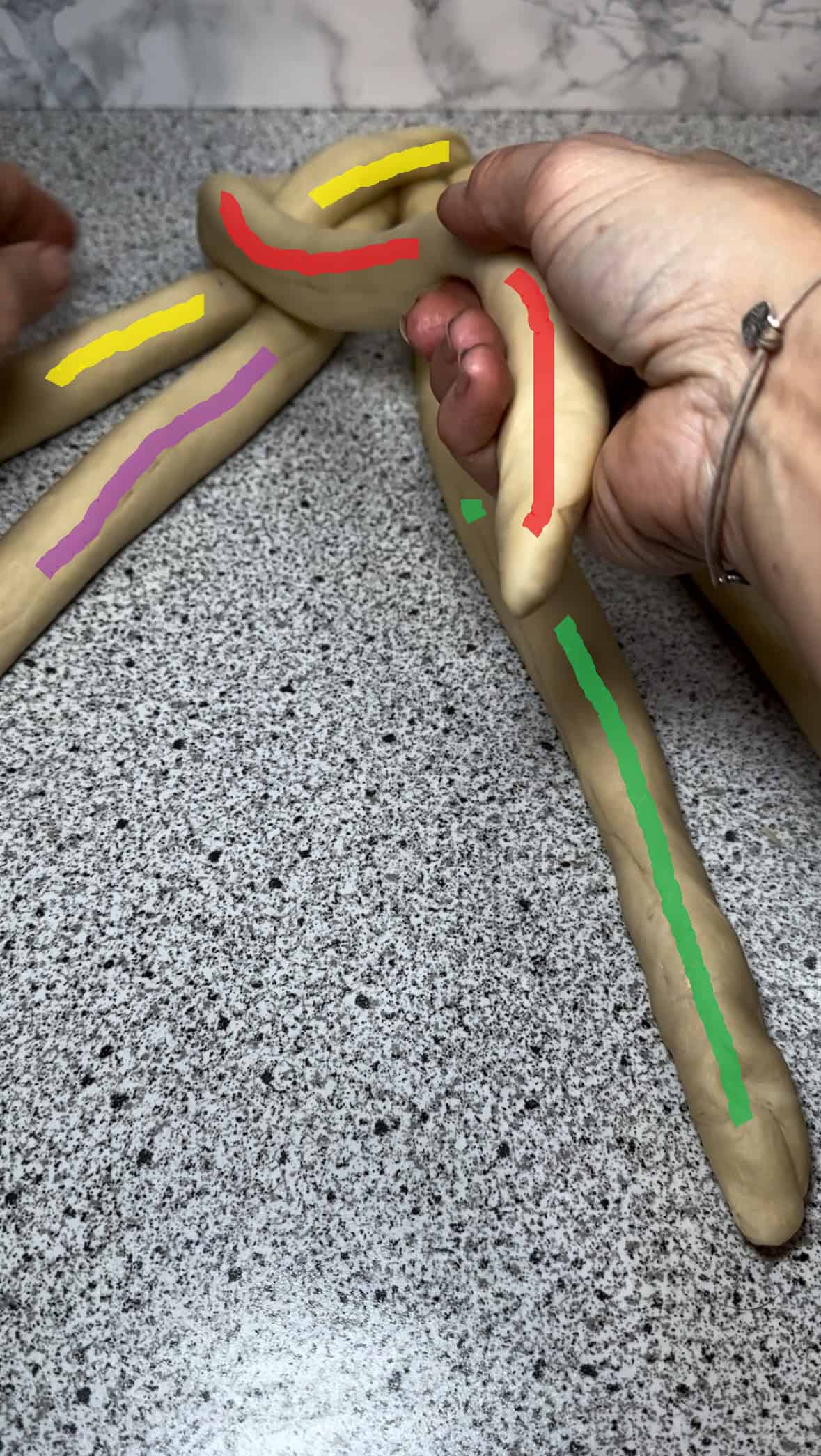 Der ganz rechte Strang (gelb) wird über 3 Stränge hinweg nach links gelegt (links von lila).
