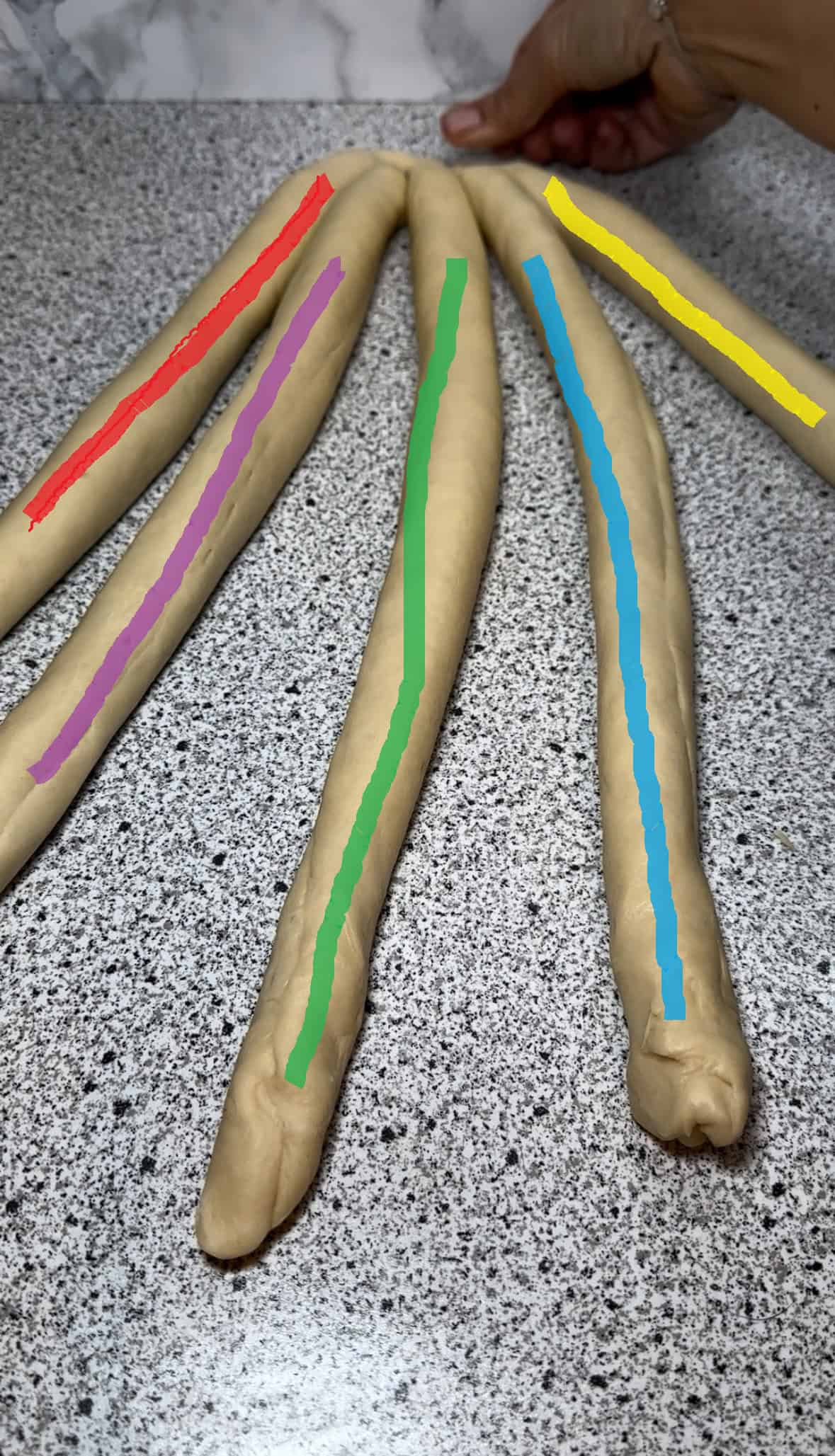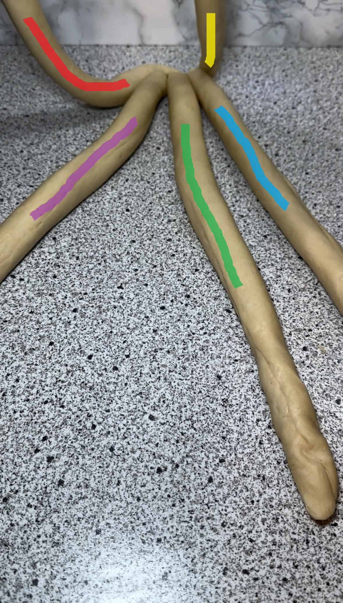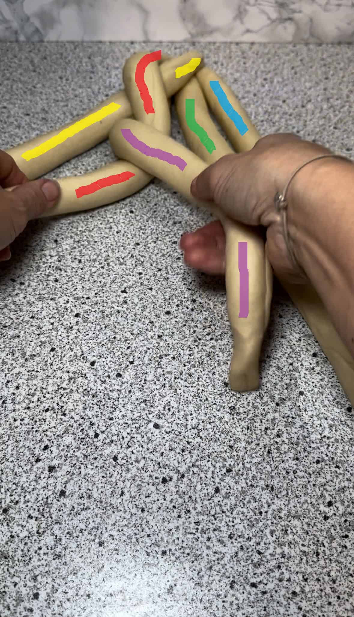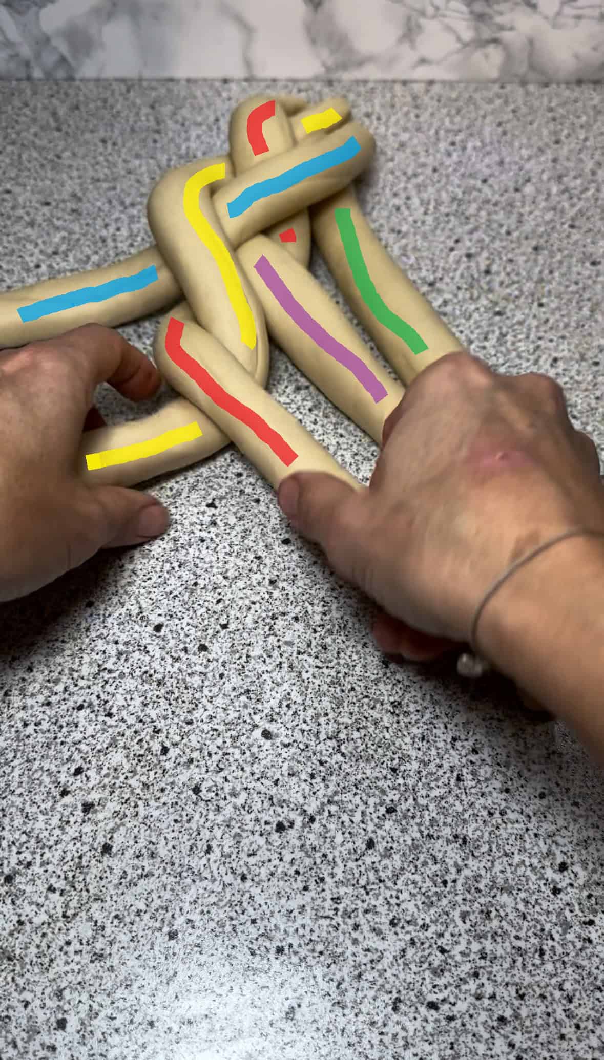 Der ganz rechte Strang (gelb) wird über 3 Stränge hinweg nach links gelegt (links von lila).