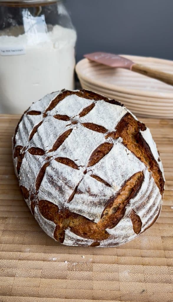 Um 8 Uhr habe ich den Ofen auf 250 Grad vorheizt, Brot aus dem Kühlschrank geholt & ein Muster reingeschnitten, ab in den Ofen, Baking Shell von Brod & Taylor darüber gestülpt & 20 min backen lassen