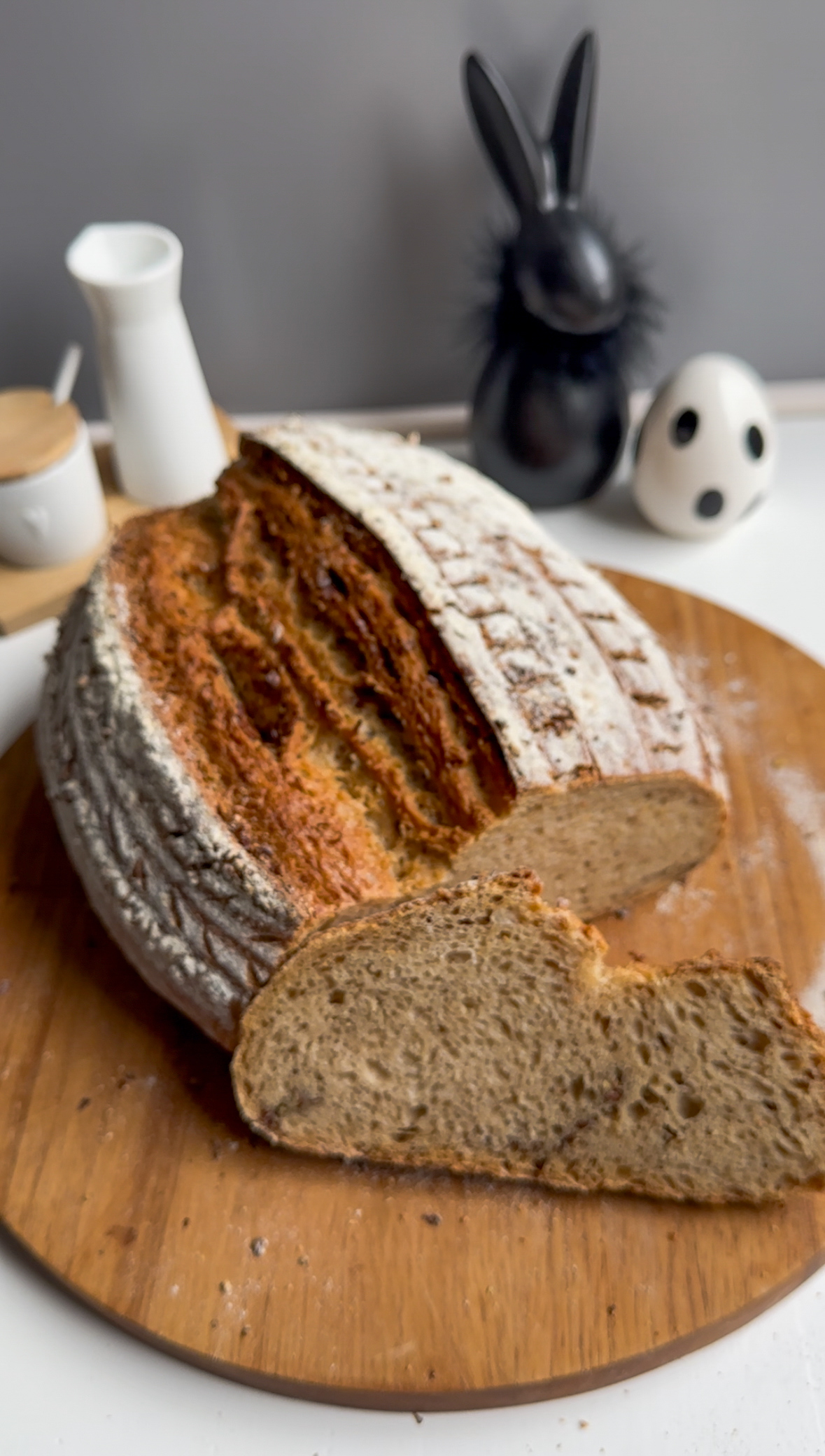 Am nächsten Morgen wird der Backofen mit dem gusseisernen Topf auf 250 Grad vorgeheizt. Zum Scoren habe ich das Brot erst für ca. 30 min in der Tiefkühltruhe gelagert und dann eingeschnitten. Dann fällt der Teig nicht so schnell auseinander.