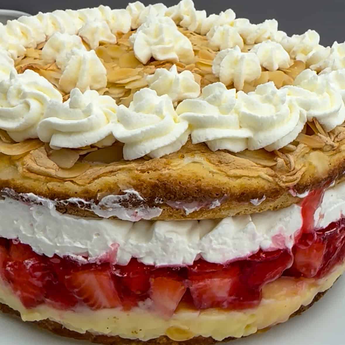 Mandelsplitter Torte mit frischen Erdbeeren 🍓. Diese Torte besteht aus 2 Böden mit Baiser-Mandelblätter-Topping. Dazwischen befindet sich leckeres Obst, Sahne und Vanillepudding.