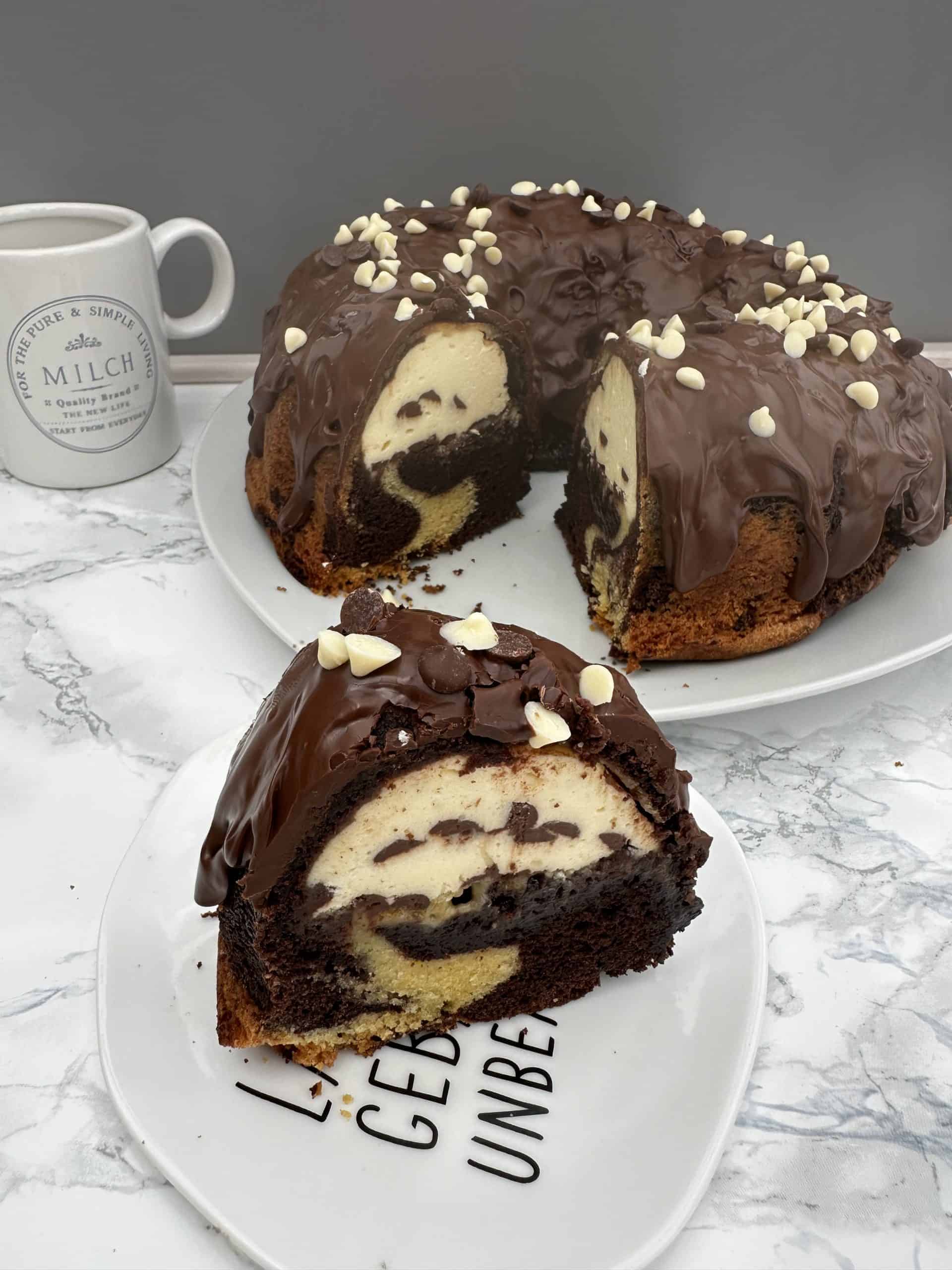 Ein Marmorkuchen vereint mit Käsekuchen und Schokostücken – eine absolute Mega-Kombi