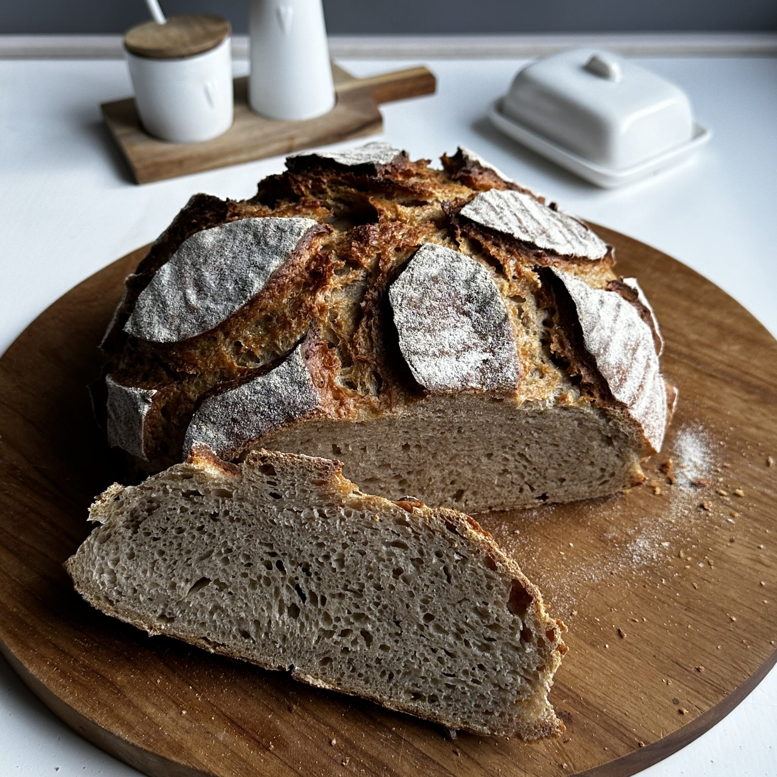 - Mit Deckel für 20 Minuten bei 250 Grad (nach 5 Minuten 4 Eiswürfel unter das Brot geben)