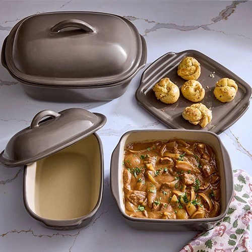 Stoneware ist jederzeit einsatzbereit und muss nicht vorgeheizt werden. Der Backofen kann – je nach Rezept – vorgeheizt werden.