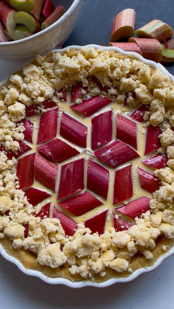 - Alle Zutaten zu Streusel schnell verkneten und später am Rand auf den Rhabarber geben