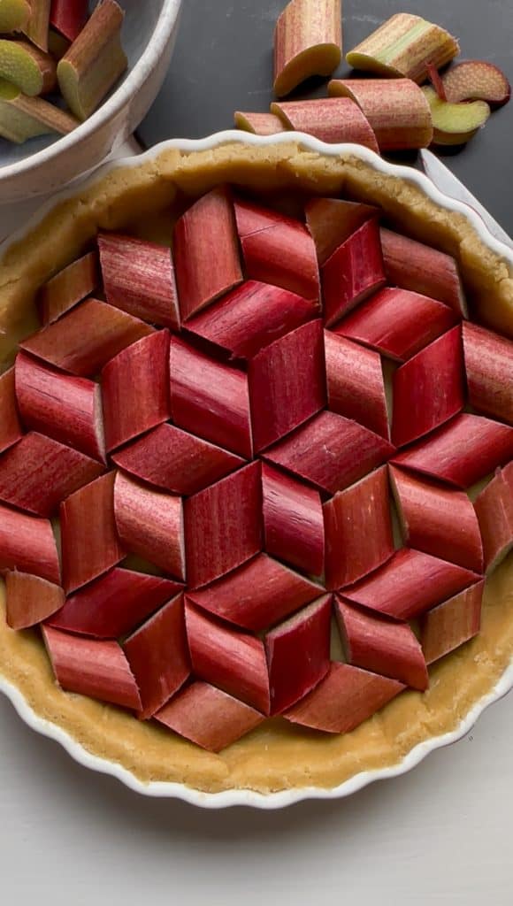 Man sollte schönen, roten Rhabarber, nicht zu dick wählen, denn den braucht man eigentlich nicht schälen. Beim Schrägschneiden immer die gleich Richtung wählen und die Breite wird so gewählt, dass die der Länge der Schnittkante entspricht. Das macht das Anordnen im Muster (siehe Foto) einfacher.