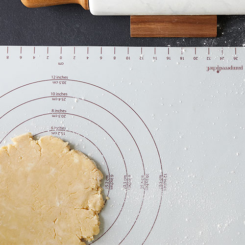 👉Eine Teigunterlage mit Hilfe des Edelstahl-Streufix mit etwas Reismehl bestreuen und
