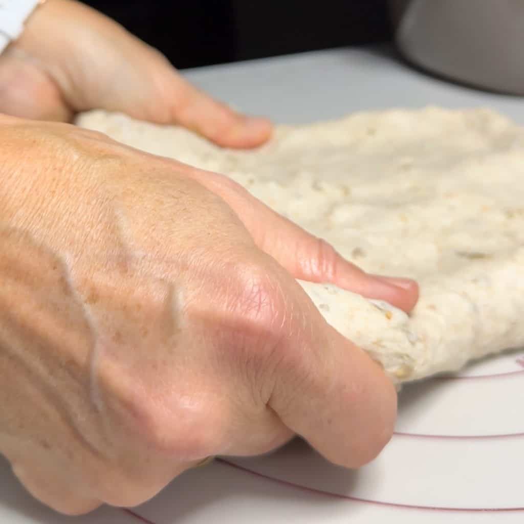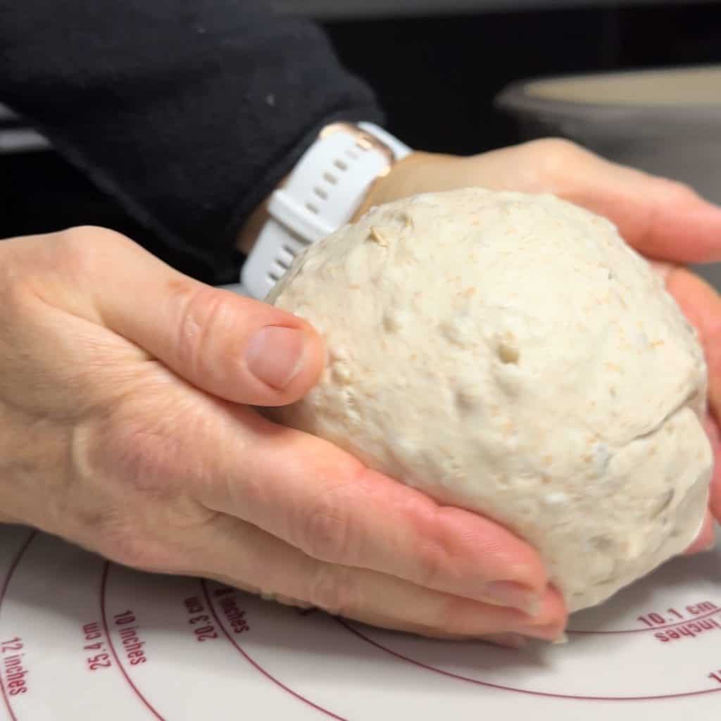- bemehle eine Teigunterlage ganz dünn, gib den Teig darauf, dehne und falte den Teig etwas, forme ihn zu einer Kugel