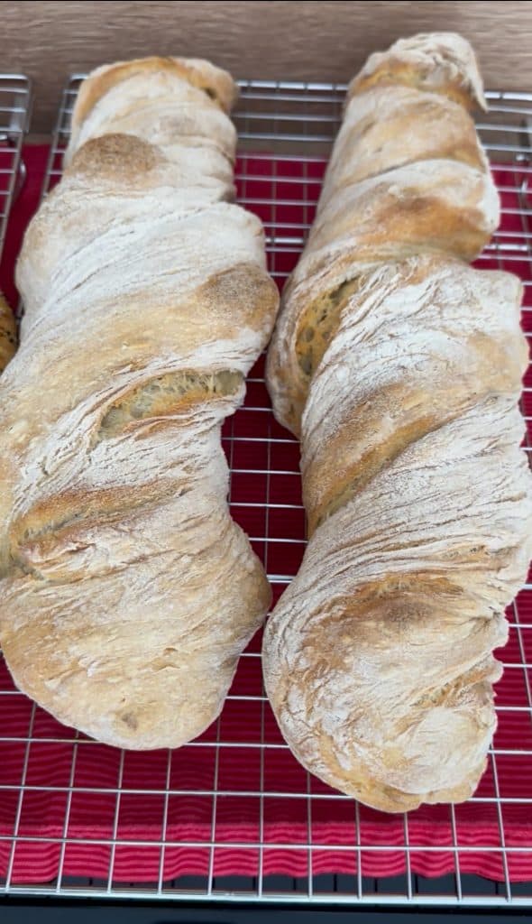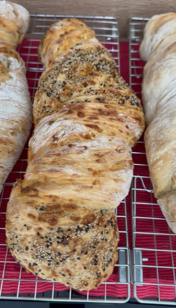 Das ist die Variante naturbelassen. Hier links ist die Variante mit Käse und Sesamkörner in Schwarz und Natur. Die Angaben im Rezept sind für 1 Wurzelbrot.